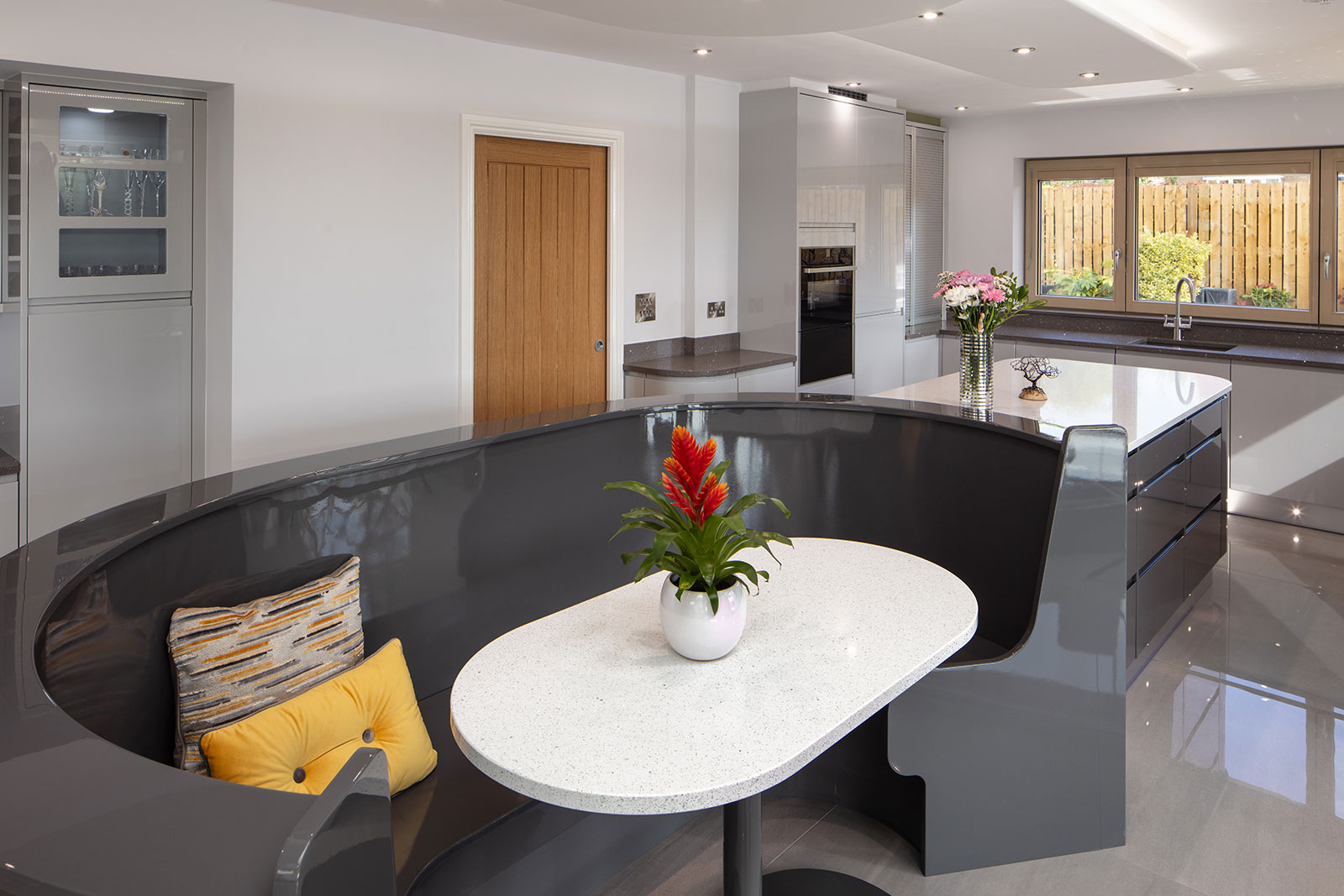This project was for a grand design self-build home for a new customer who had seen some of our work in a friend’s house & been recommend by someone else too. We were involved from quite an early stage so we could have some input on window & door positions which made a big difference to the final outcome. The customer wanted a wow factor kitchen in the main open plan living area with some type of integrated seating rather than breakfast bar stools, they also wanted a fully working kitchen out the back that they could cook in & make a mess that the guests wouldn’t see.
