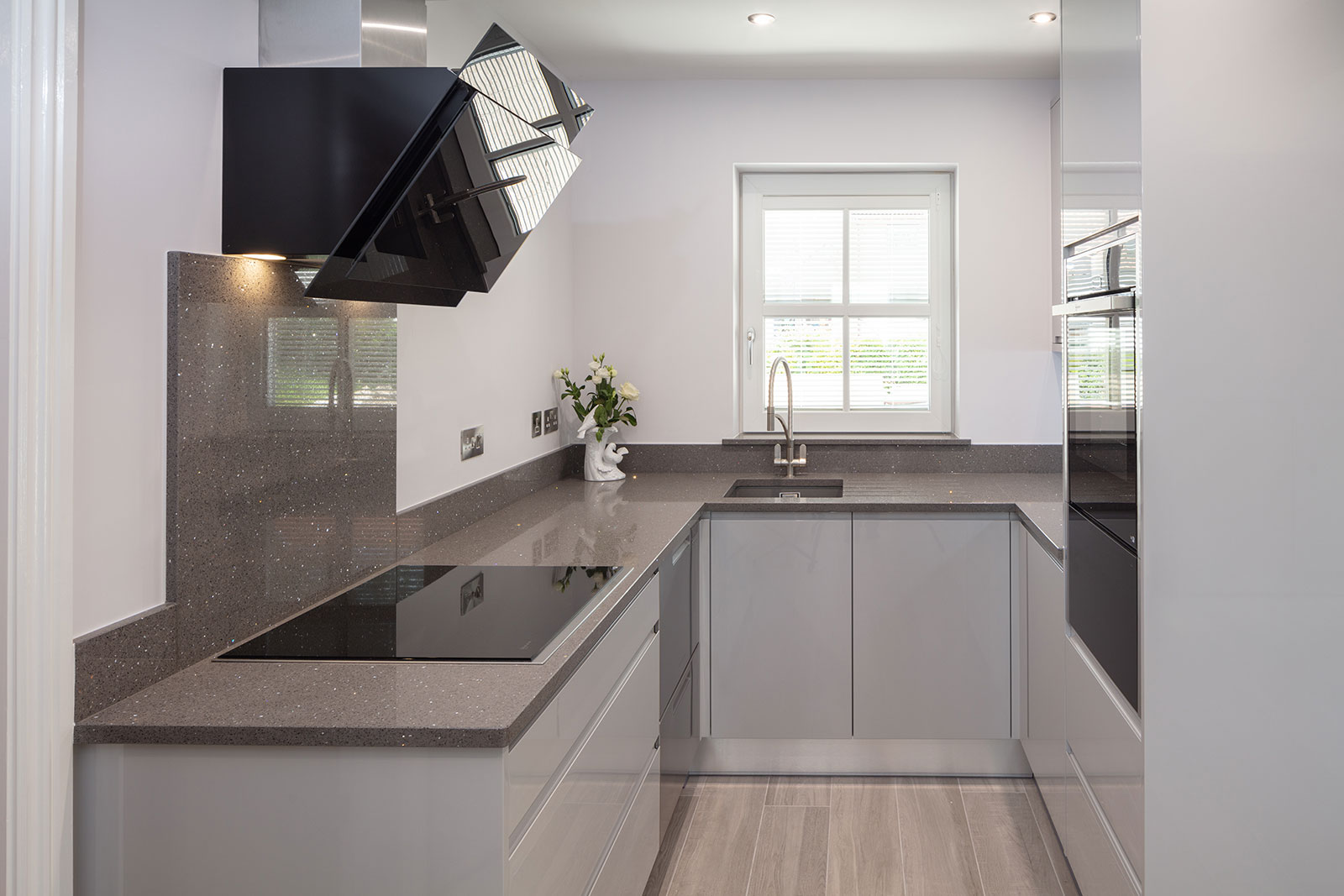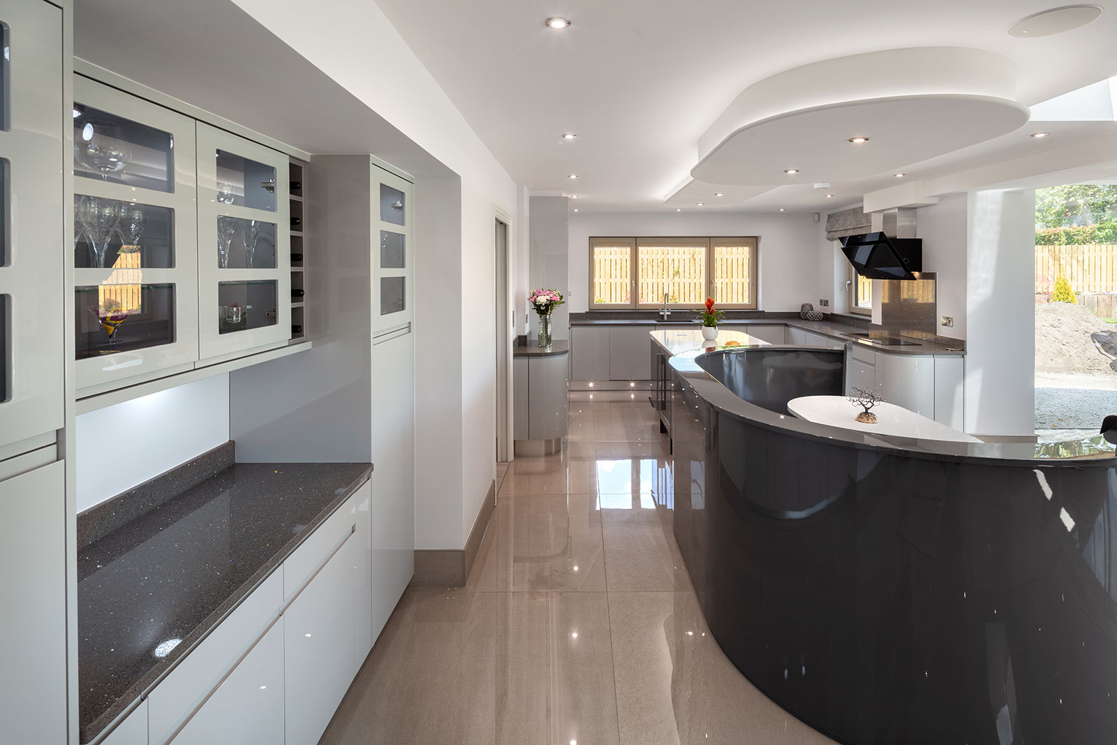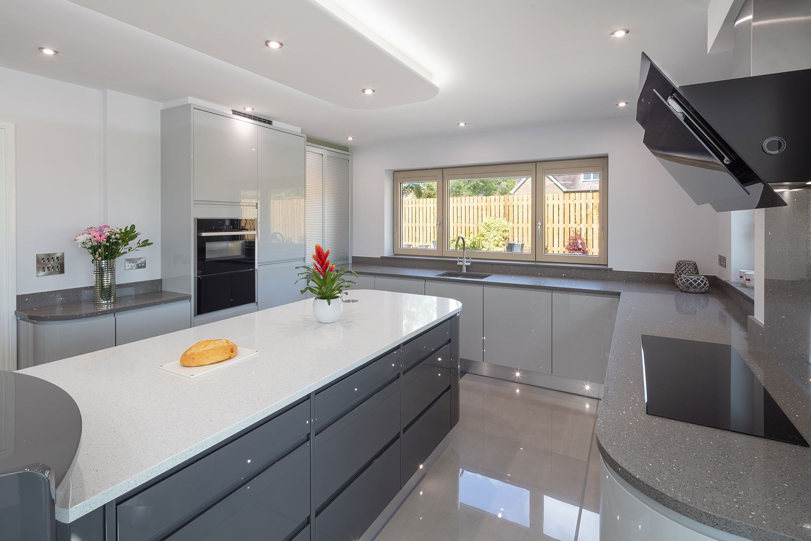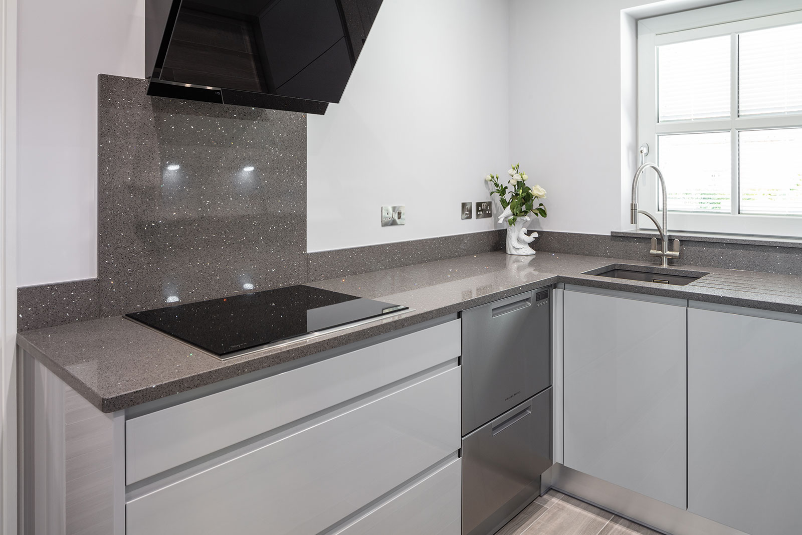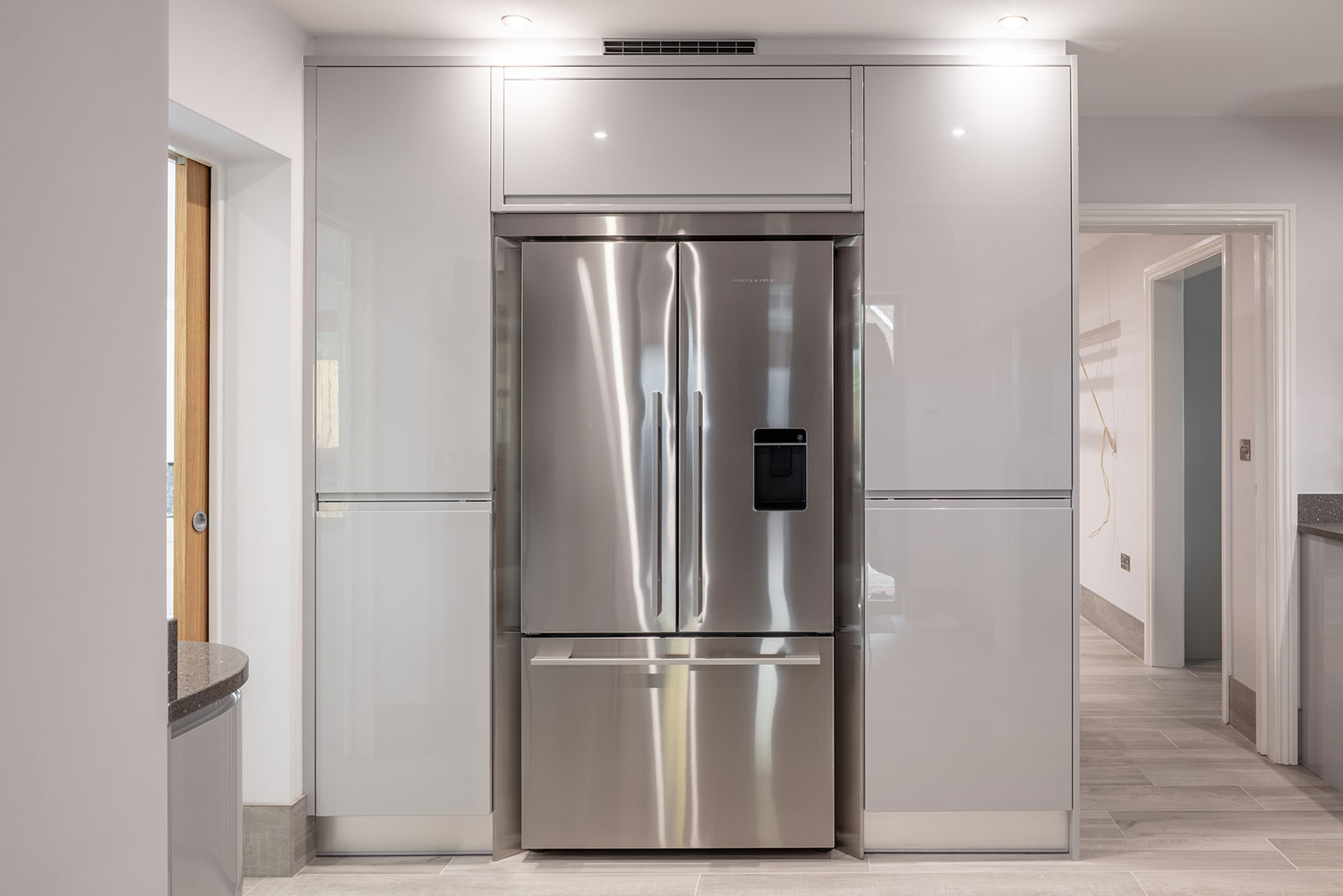 Items used in this job include, Fisher & Paykel appliances, Neff appliances, Grey & White Mirror Chip Quartz work surfaces, Crown Imperial Units, Blanco undermount sinks, Franke taps & Blum soft close hinges & drawer boxes.