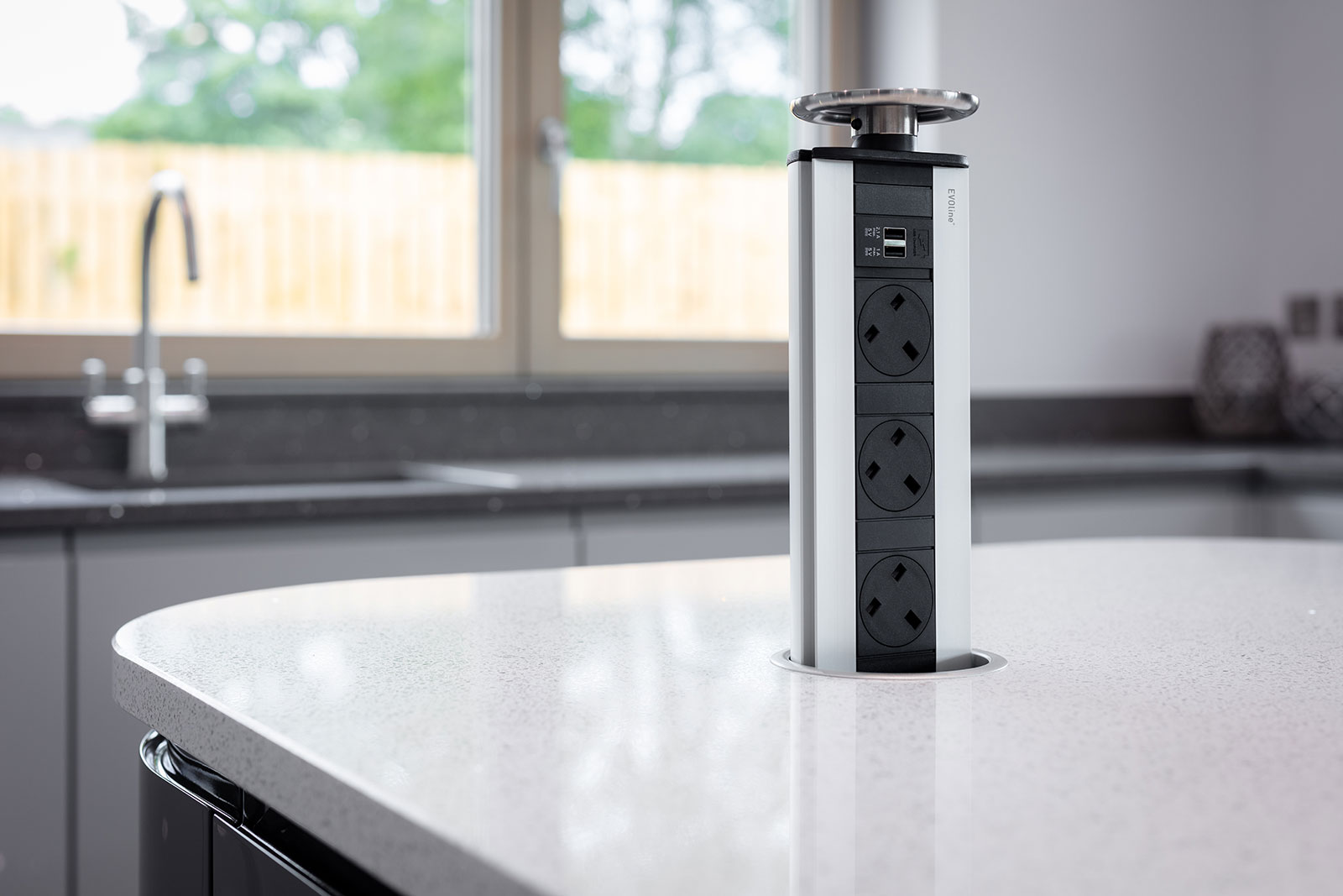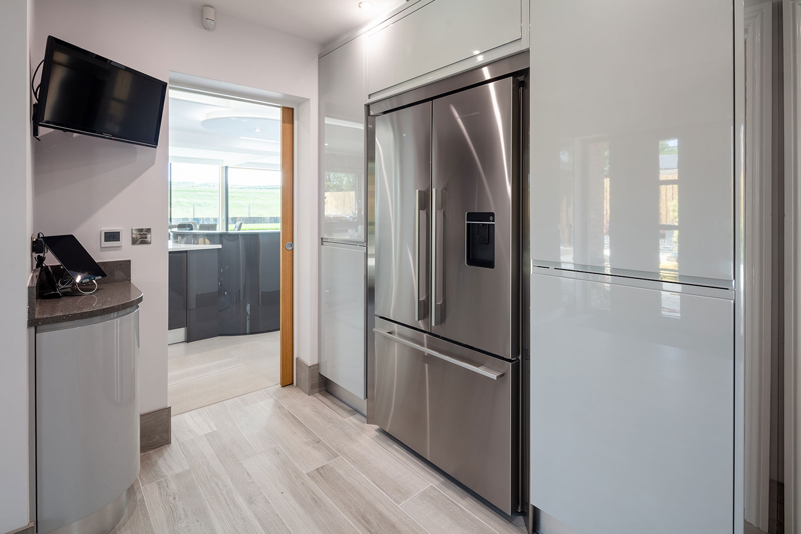 For the back kitchen, although it was more compact than the main kitchen we managed to fit everything you could possible need to prepare a meal fit for a king. Once we had completed the main kitchen & the back kitchen the customer then asked us to design & install a laundry room, a walk-in wardrobe, two bedrooms, a home office, storage in a plant room, three bespoke media units & an outdoor BBQ area.