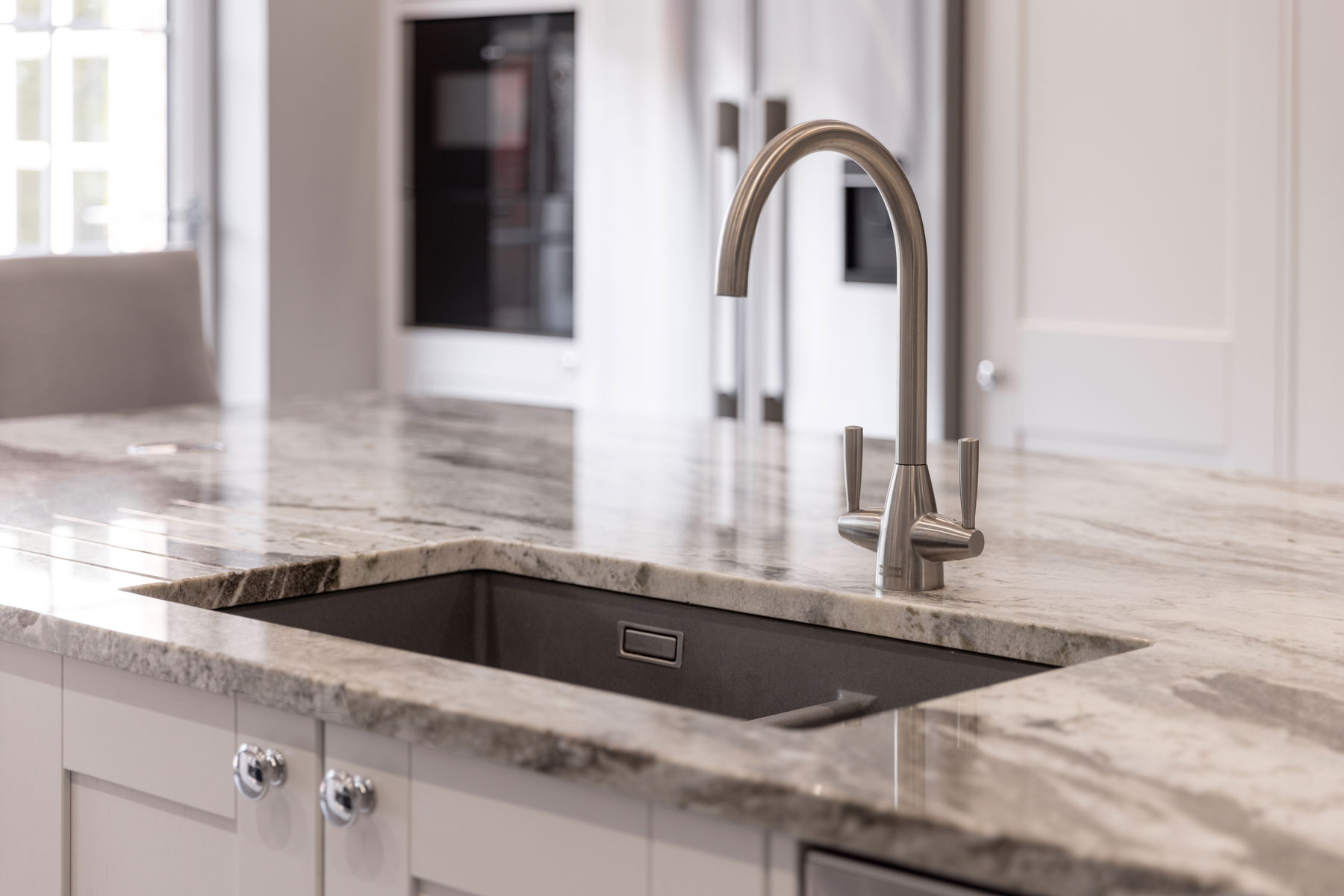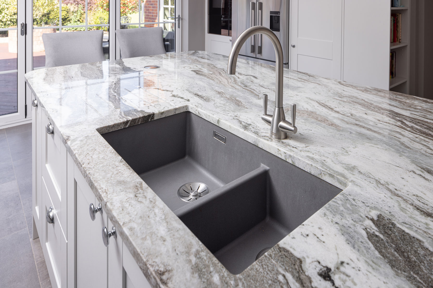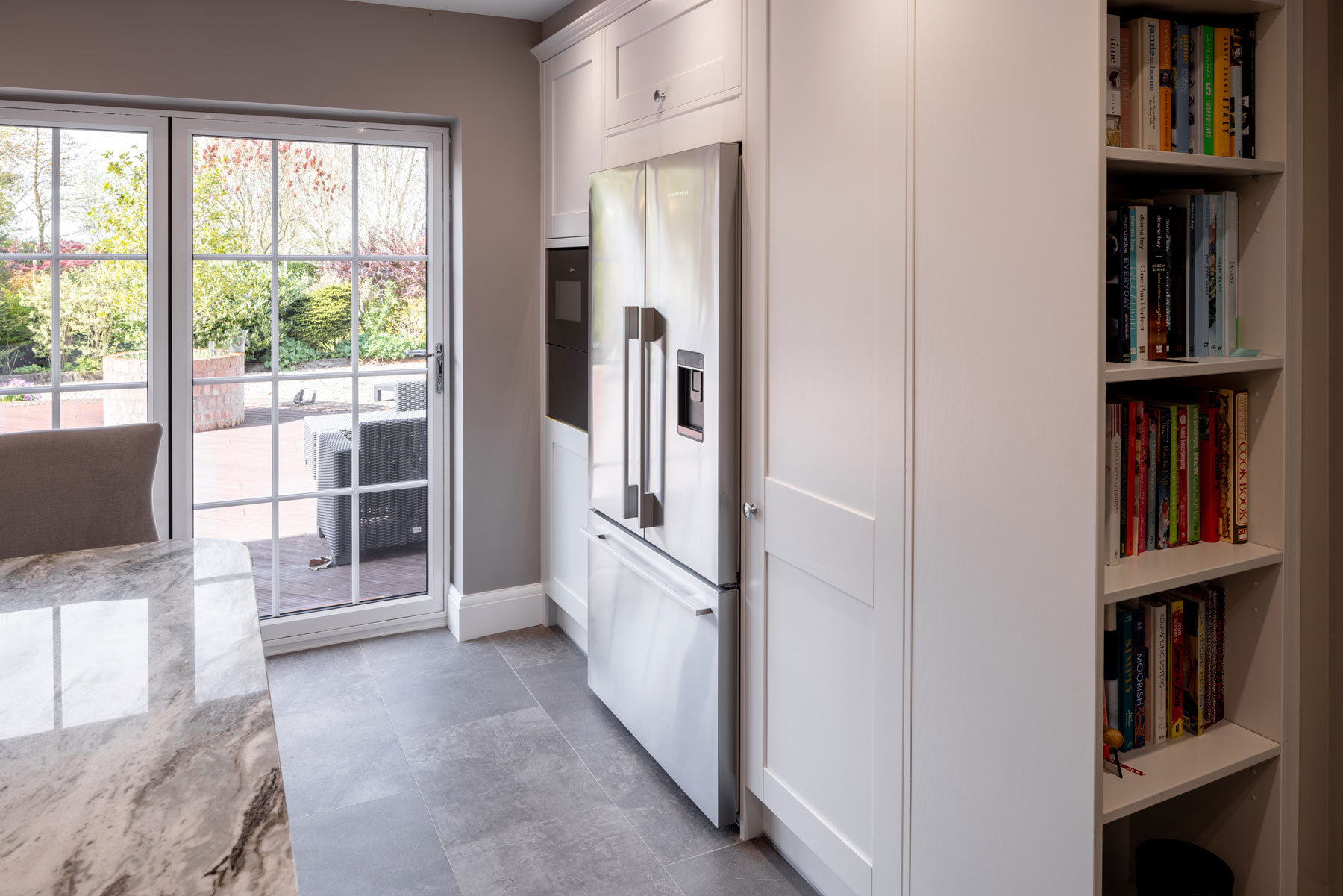 This fantastic kitchen was designed for a repeat customer of ours that was moving house, the kitchen that was in the house was tired & dated with a cream coloured Aga & a huge ceiling boxing with an extractor in the middle of the room. Our customer wanted the room to be light, bright & open with lots of storage & a grand feature island, they also wanted somewhere to display cook books & an American style fridge freezer, but not just plonked on the end, it needed to look like it was part of the kitchen. So we came up with this design which incorporated the Fisher & Paykel American style fridge freezer between some over depth tall units, we used a classic painted Oak shaker style kitchen & then a real wow factor feature worktop, the island was almost 3m long by 1.5m wide all done as one full slab to create the focal point in the room. The built under ovens with induction hob above add the modern range cooker look & the hidden extractor keeps it looking sophisticated & sleek. With tall larder units on the end wall there was plenty of storage & the floor to ceiling book case was enough to give all of their books a new home.