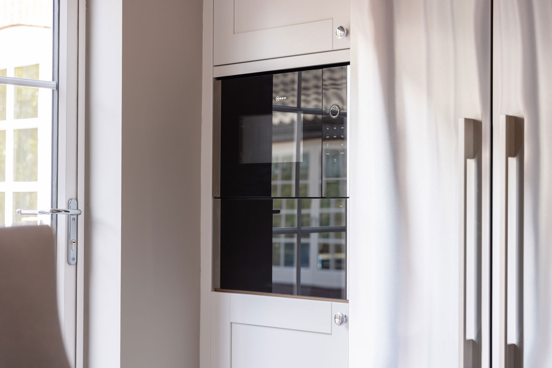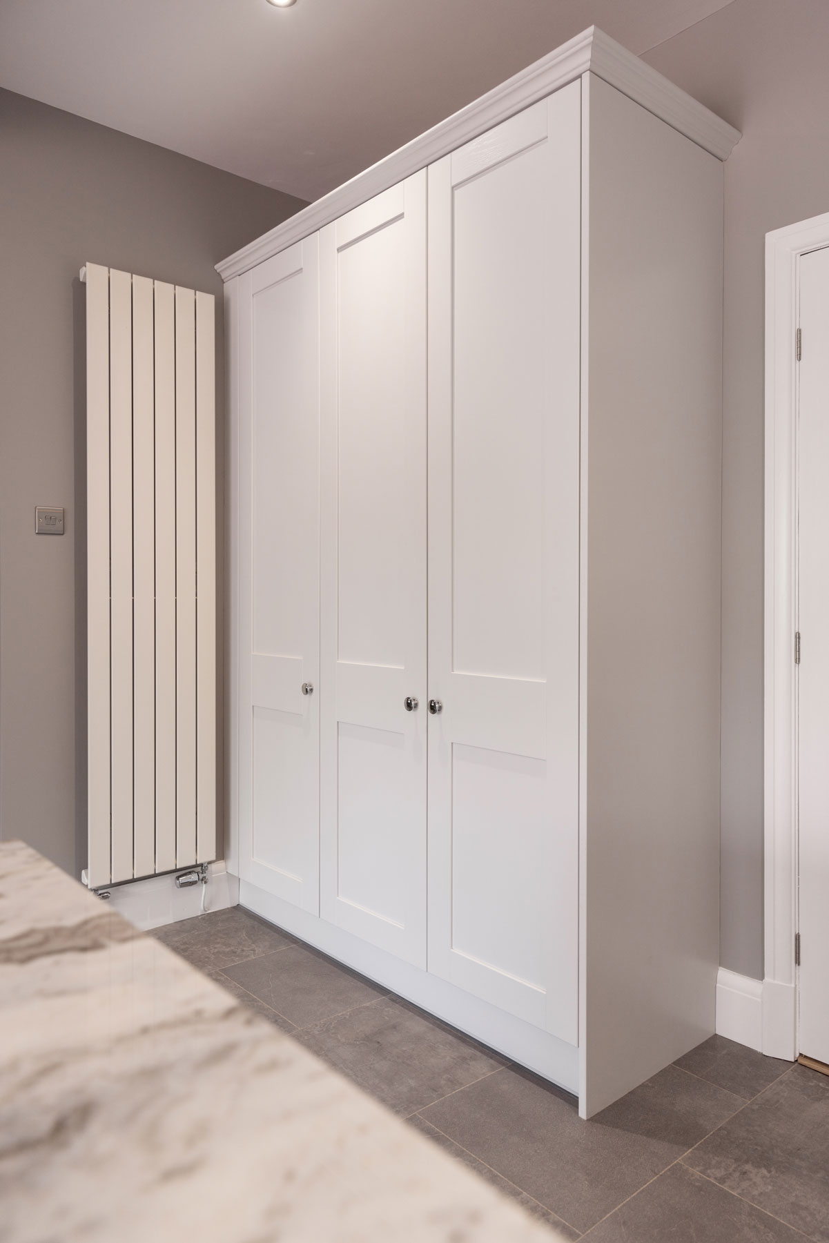 Items used in this kitchen include, Fisher & Paykel appliances, Neff Appliances, Fantasy Brown granite worktops, upstands & splashback, Crown Imperial Midsomer Painted Oak Shaker Style Fascia’s, Blanco sink, Franke tap, Hafele lighting & pull-out mechanisms, Blum soft close hinges & drawer boxes, Evoline Power Port & Karndean flooring.